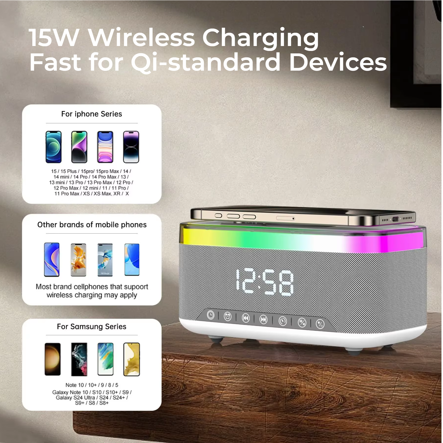 Bluetooth Speaker Alarm Clock with Wireless Charger & Colorful Night Light